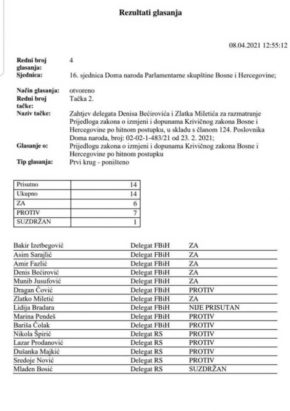 Zahtjev Denisa Bećirovića i Zlatka Miletića za razmatranje izmjene i dopune Krivičnog zakona BiH po hitnom postupku, kojim se traže kazne za negiranje genocida, Holokausta, zločina protiv čovječnosti i ratnih zločina protiv civilnog stanovništva, našao se na dnevnom redu sjednice Doma naroda Parlamentarne skupštine 8. aprila, ali nije izglasan.