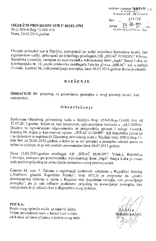 udjele “Alumina” d.o.o. i “Mehanika” d.o.o. prenio u “Birač Europe” Litvanija
