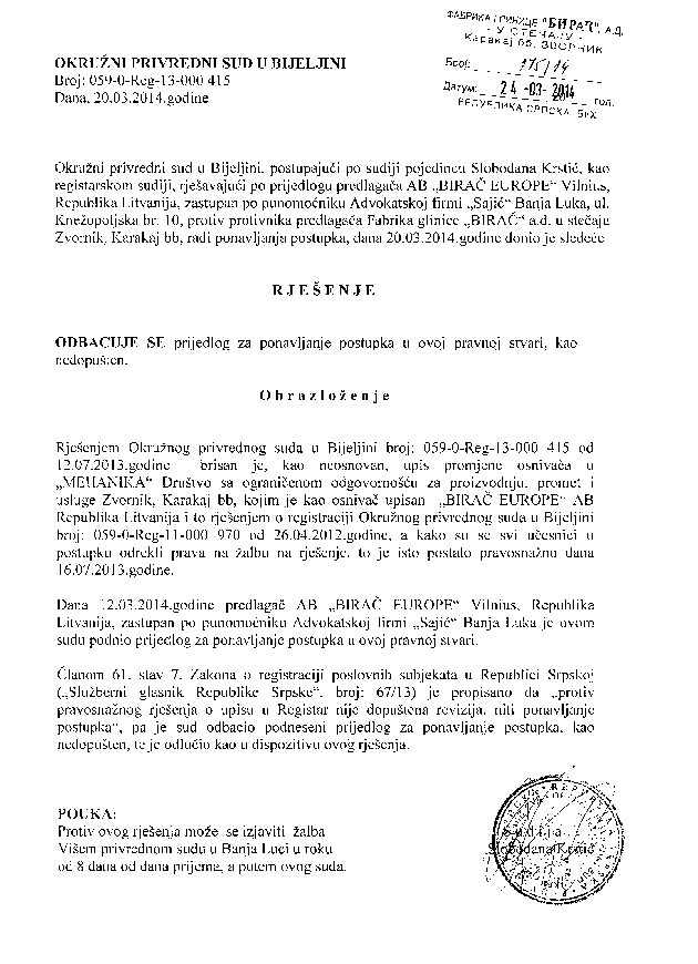 sud u Bijeljini donio je Rješenje kojim je odbacio kao nedopušten prijedlog za