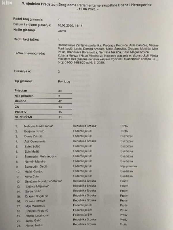 Protiv su bili zastupnici iz njegovog SNSD-a te logično partnerskog HDZ-a. Suzdržane su bile kolege iz SDA, a za smjenu je bila opozicija, odnosno zastupnici SDP-a, SDS-a, Naše stranke i PDP-a.