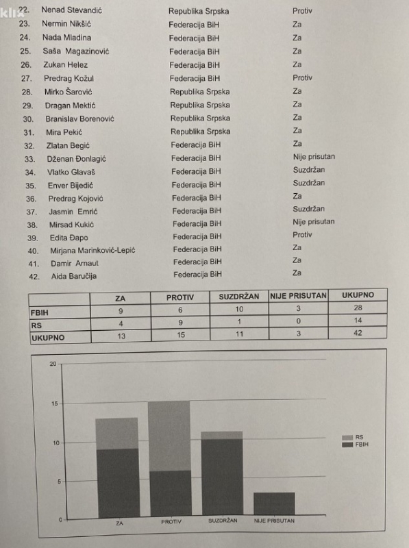 Zanimljivo je da je protiv smjene Staše Košarca glasala zastupnica SBB-a Edita Đapo, a da su suzdržani bili članovi Kluba DF-a Vlatko Glavaš i Enver Bijedić.