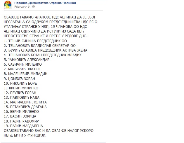 Politički transferi – Predsjednik i 18 članova opštinskog odbora NDS Čelinac prešli u DNS