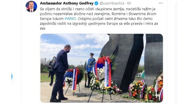 Pominjući te žrtve ambasador Godfi je naveo Jevreje, Rome i Slovene. Srbe nije pomenuo i to je bio razlog da hiljade tviteraša pitaju zašto ne izgovara ime njihovog naroda.