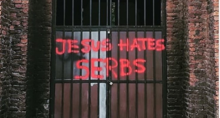 "Isus mrzi Srbe’ – rečeno mi je da je ovo svježe ispisan grafit na nedovršenoj srpskoj pravoslavnoj crkvi u Prištini nakon današnje liturgije, koja je bila prva liturgija od 1998. godine", napisao je Bankroft.