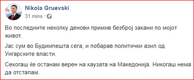"Ja sam u Budimpešti i zatražio sam politički azil od vlasti u Mađarskoj", napisao je Gruevski na svom Fejsbuk profilu.