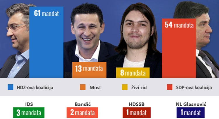 Kako navode, obrađeno je 100 odsto biračkih mjesta, a HDZ ima 61 mandat, Narodna koalicija 54, Most 13, Živi zid 8, IDS 3, Bandić 2, HDSSB 1, Glasnović 1.