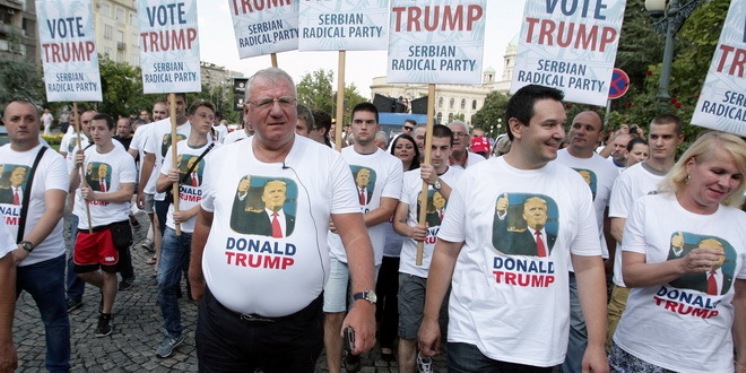 Većina okupljenih, uključujući i lidera radikala, nosila je majicu sa Trampovim likom i natpisom „Glasajte za Trampa — Srpska radikalna stranka“, na engleskom jeziku.