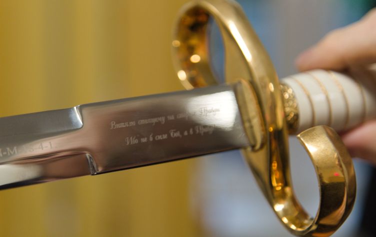 Na njemu stoji zapis „vitezu nad vitezovima“, na ruskom i srpskom jeziku.