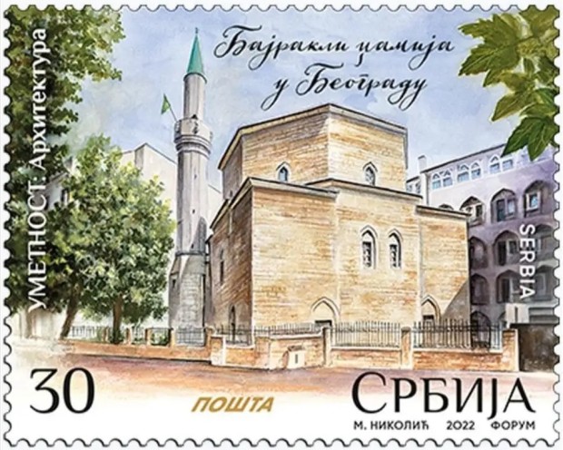 Бајракли џамија у Београду на поштанској марки Поште Србије, поводом 500 година од њене изградње, јуна 2022.