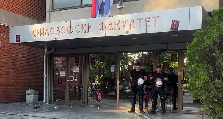 Iz MUP-a Srbije je saopšteno da se sinoć oko 300 učesnika skupa oglušilo na upozorenja policije i pokušalo nasilno da uđe na glavni ulaz Fakulteta, nasrnuvši na kordon Interventne jedinice.