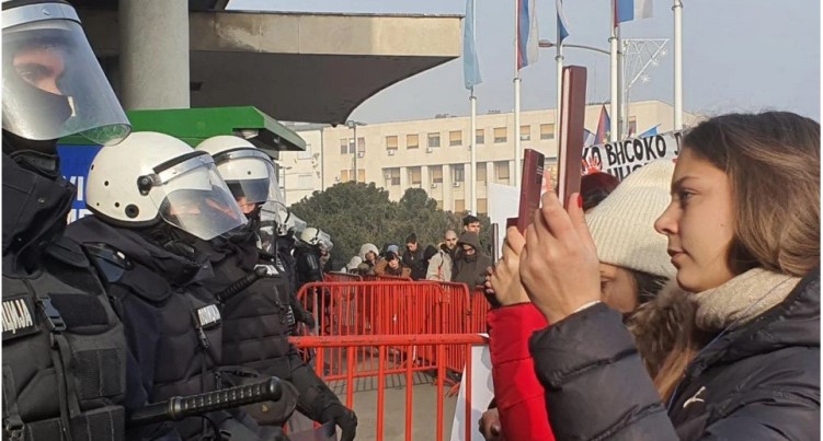 Studenti su stajali u tišini držeći transparente sa natpisima: "Zimska akcija izaziva reakciju", "Mi smo obnovljivi izvor promena", "Naša borba neće biti slomljena", "Tresu se temelji", "Transparent u ruci i inženjer po struci".
