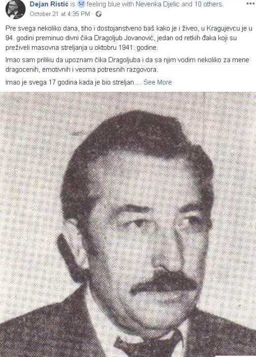 "Prije svega nekoliko dana, tiho i dostojanstveno baš kako je i živio, u Kragujevcu je u 94. godini preminuo divni čika Dragoljub Jovanović, jedan od rijetkih đaka koji su preživjeli masovna streljanja u oktobru 1941. godine.