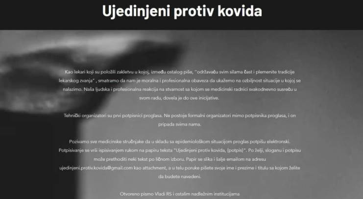 "Mi, dole potpisani medicinski radnici Republike Srbije, odlučujemo se na javno istupanje jer ne vidimo drugo rešenje za javno-zdravstvenu katastrofu u kojoj se naša država nalazi. Ne samo Hipokratova zakletva, već i opšta etika nalaže da ukažemo na probleme koji su zdravstvene radnike doveli u ovu situaciju i otežavaju im dalji rad. U interesu je javnosti da se ovi problemi istraže, odgovorni pojedinci i institucije procesuiraju i naprave koraci ka zdravstvenom sistemu bez straha i prevage politike nad stručnošću.