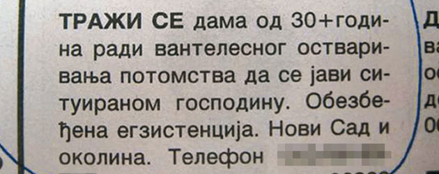 Oglas u novinama je tek prvi korak – kaže u svojoj neobičnoj ispovjesti za "Novosti" Novosađanin R. L. (62) koji je dao oglas u lokalnim novinama, tražeći ženu za vantjelesnu oplodnju.