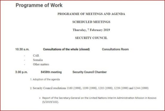 Kako je navedeno u programu rada Savjeta bezbjednosti UN-a za današnji dan, sjednica na kojoj će se raspravljati o novom tromjesečnom izvještaju o radu Unmika zakazana je za 15 časova po lokalnom vremenu, odnosno 21 sat po srednjoevropskom vremenu.