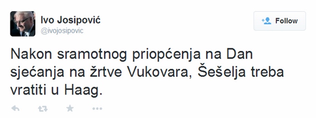 Odgovor je stigao od predsjednika Republike Hrvatske Ive Josipovića, koji je na svom Twitter profilu napisao kako nakon ovoga, Vojislava Šešelja treba poslati nazad u Hag.