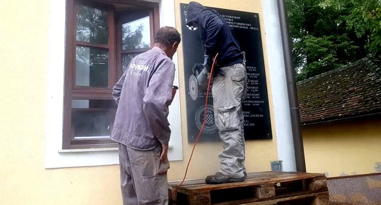 Tablu, prema priloženim fotografijama, skidaju radnici NOVOKOM Novska, gradsko komunalno poduzeće.