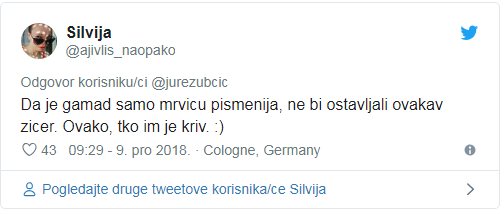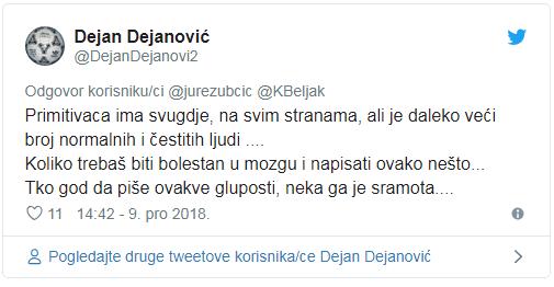 "Primitivaca ima svugdje, na svim stranama, ali je daleko veći broj normalnih i čestitih ljudi …. Koliko trebaš biti bolestan u mozgu i napisati ovako nešto… Tko god da piše ovakve gluposti, neka ga je sramota…", poručio je drugi tviteraš.