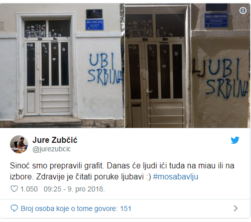 Kako dalje piše "Index", nimalo maštovit, ali i nepismen, grafit "ubi Srbina" ispravljen je na vrlo jednostavan način – dodavanjem jednog "malog, a tako važnog slova ‘lj'", tako da sada piše "Ljubi Srbina".