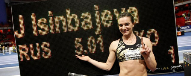 Јелена Исинбајева, оборила је сопствени свјетски рекорд у скоку мотком у дворани пошто је на митингу у Стокхолму прескочила висину од 5,01 метара.