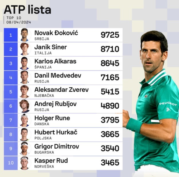 Kako je i na Mastersu u Madridu u opticaju 1.000 poena, Siner bi već tada, između 24. aprila i 5. maja, mogao da prestigne Novaka.