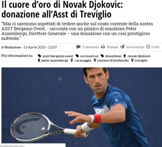 "Impresionirao me je Novak Đoković, najbolji teniser svijeta, koji je poslije ogromnih donacija Srbiji, pomogao i nama. Kada je čuo vijesti iz naše provincije, iz Lombardije, pomogao je. On je veliki čovjek. Nadam se da ću uskoro moći da ga zagrlim", rekao je Peter Asembergs, direktor zdravstvenog centra Bergamo, u intervjuu za "Porta a porta".