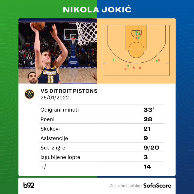 Jokić ove sezone u NBA prosečno bilježi 26,1 poen po meču, uz 13,8 uhvaćenih lopti i 7,6 završnih dodavanja.