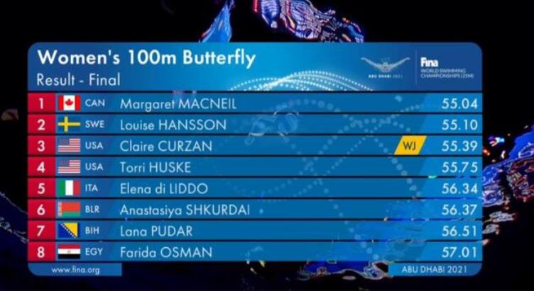Drugo mjesto je osvojila Šveđanka Louise Hansson (55.10), a treće Amerikanka Claire Curzan (55.39) koja je postavila novi svjetski juniorski rekord.