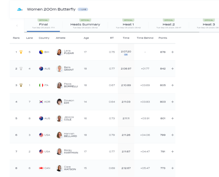Koliko je dominatna bila bh. plivačica pokazuje i podatak da je drugoplasiranu Bellu Grant ostavila sekundu i 77 stotinki.