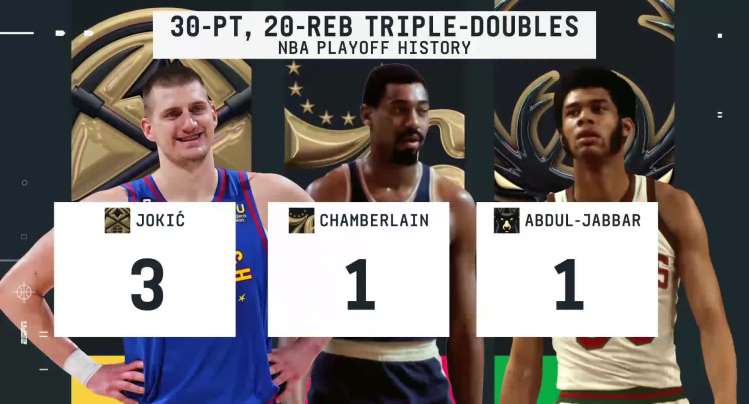 Nikola Јokić je treći put u karijeri stigao do najmanje 30 poena, 20 skokova i 10 asistencija u plej-ofu.