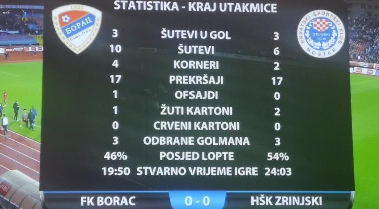 Igrao se 14. minut. Zrinjski je prvi zaprijetio. Mario Ćuže je pogodio stativu, doduše golman Borca Mijatović je odbranio uz pomoć okvira gola.