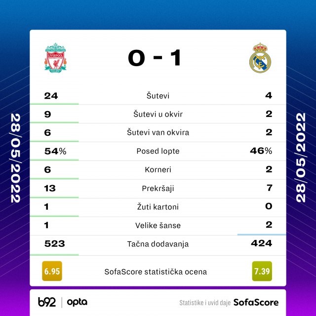 Izabranici Karla Ančelotija su sa samo četiri udarca ka golu Alisona (od toga jedan u okvir) stigli do pobede, dok protivniku nisu bila dovoljna ni 23 pored raspoloženog Tiba Kurtoe.