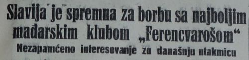 „Ovim svojim uspjehom da igra u Srednjoevropskom kupu Slavija je mnogo zadužila sve sarajevske sportiste. Stoga vjerujemo da u srijedu neće biti ni jednoga sportiste u Sarajevu koji neće doći na Stadion Slavije da se divi mađarskim profesionalcima i da bodri Slaviju da bar iz prve igre izvuče pobjedu i napravi još jedan senzacionalan sportski događaj“ piše „Jugoslovenska pošta“ u izdanju za 17.06. predviđajući Slavijin uspjeh.