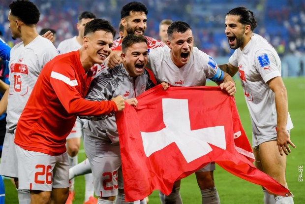Ardon Jašari, Đerdan Šaćiri, Granit Džaka i Rikardo Rodrigez slave pobedu nad Srbijom