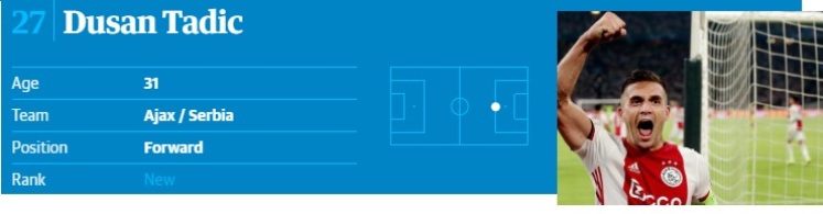 "Malo je vjerovatno da bi Tadić bio na ovoj listi da je ostao u Sautemptonu u ljeto 2018. Srpski krilni igrač bio je pristojan igrač u Premijer ligi, ali mu se karijera promijenila otkako je prešao u Ajaks. Njegova igra poprimila je nove dimenzije i odigrao je ključnu ulogu u Ajaksovom plasmanu u polufinale Ligu šampiona. Tadić, koji je početkom decembra postigao 48 golova u 82 utakmice za Ajaks, impresionirao je kao "lažna devetka", a ujedno je pomogao ekipi Erika Ten Haga da osvoji titulu u prvenstvu i Kupu Holandije", stoji u opisu Tadića.