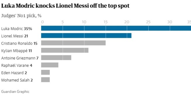 Gardijan je objavio svoju tradicionalnu godišnju listu od sto najboljih svjetskih fudbalera za 2018. godinu, a na prvom mjestu je igrač Reala Luka Modrić sa 246 bodova, a 79 sudija ga je izdvojilo kao broj 1 (u poređenju sa 48 sudija za Messija i 33 za Ronaldo).
