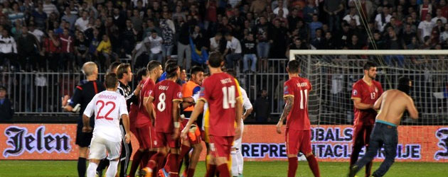 Utakmica između Srbije i Albanije prekinuta je 14. oktobra pred kraj prvog poluvremena, kada se iznad terena stadiona Partizana pojavila bespilotna letjelica, dron, sa zastavom takozvane Velike Albanije, nakon čega su uslijedili incidenti.