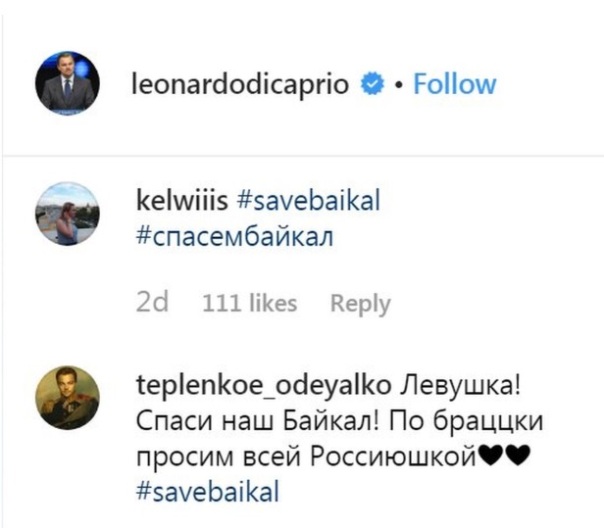 Kao jedan od najpoznatijih holivudskih zaštitnika životne sredine, Leonardo Dikaprio često koristi Instagram kako bi potaknuo druge da brinu o planeti. Međutim, u posljednje vrijeme, u svojim komentarima, barem u dijelu komentara, dominira jedinstveno pitanje – sudbina jezera u Sibiru.