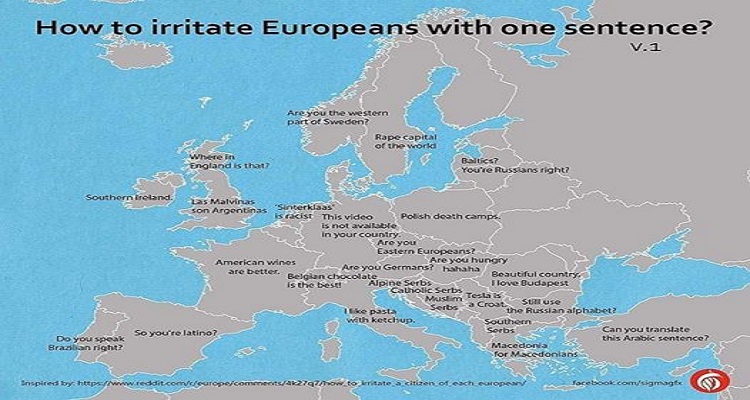Чехе и Словаке избацићете из такта ако констатујете да су источни Европљани, а балтичке народе ако их повежете са Русима. Турчина ће иритирати ако га замолите да вам преведе неку реченицу са арапског…