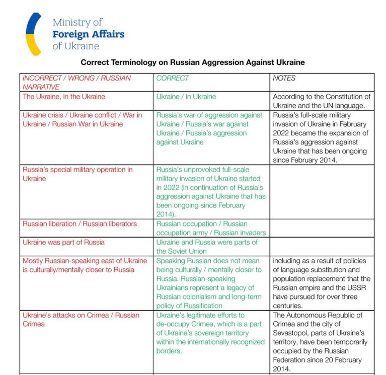 Čini se da dokument ponegde zbunjuje zvanične narative za preporučenu frazu, zahtevajući upotrebu „legitimnih napora Ukrajine da deokupira Krim, koji je deo ukrajinske suverene teritorije unutar međunarodno priznatih granica“, umesto „napada Ukrajine na Krim", na primer.