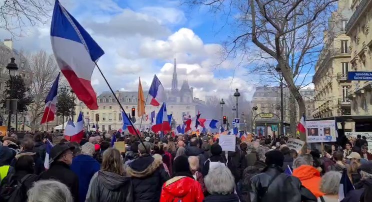 Na posterima učesnika moglo se pročitati: "Zaustavite rat koji su izazvale SAD i NATO", "Sloboda, istina, otpor", "Glasanje nepovjerenja – mir u Francuskoj".