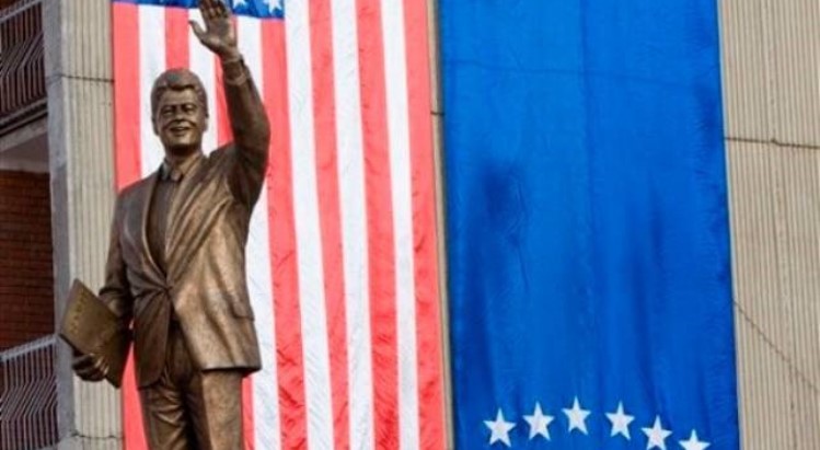 parka nekog političkog kulta, kip Bila Klintona koji maše, visok tri metra, bdi