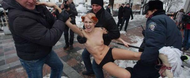 Na temperaturi ispod nule, rano ujutro, one su protestovale samo u gaćicama, dok su im na tijelima bili ispisane parole protiv vlade u Kijevu.