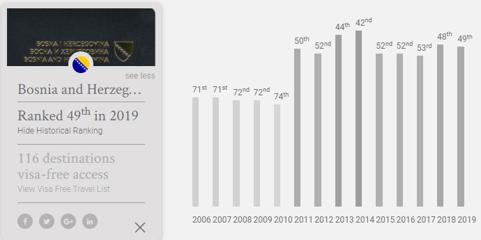 Bosna i Hercegovina je njabolje bila rangirana 2014. godine kada je zauzimala 42. mjesto, dok je ove godine zabilježen pad za jedno mjesto. U 2018. godini BiH je bila na 48. mjestu.