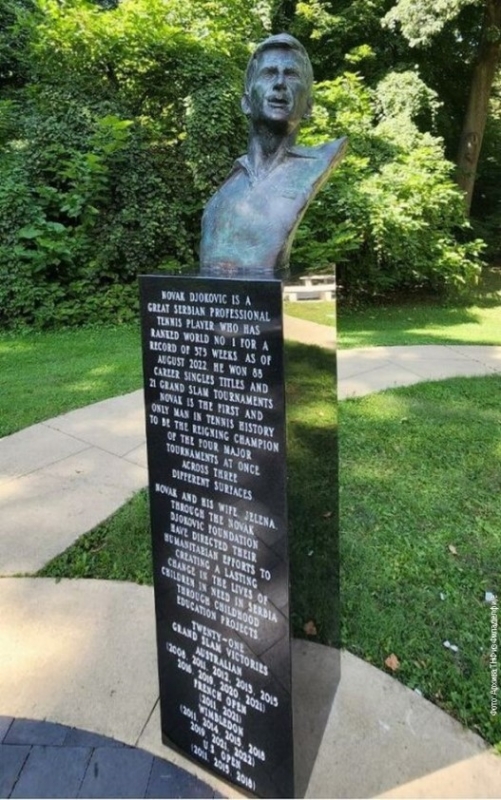 Bista Novaka Đokovića rad je vajara Bojana Mikulića iz Banja Luke, a otkriće je Aleksandar Aleks Mačeski, počasni konzul Srbije u Klivlendu, čovek koji je najzaslužniji što uopšte postoji Srpska kulturna bašta u Americi.