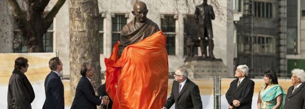 Indijski ministar finansija Arun Džatli otkrio je statutu okrenutu prema britanskom parlamentu, čime je obilježeno 100 godina od Gandijevog povratka u Indiju iz Južnoafričke Republike kako bi počeo borbu za samoupravu.