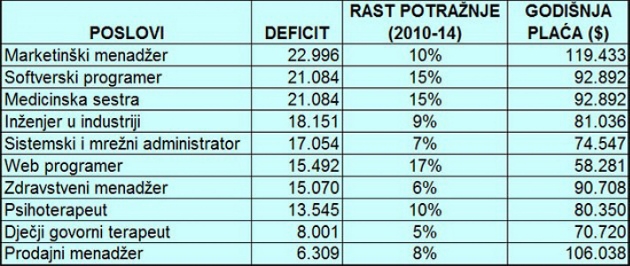 Popis najtraženijih poslova sadrži podatke o višku potražnje nad ponudom (deficit), rast broja oglasa u posljednjih pet godina te prosječnu platu za svaki posao.