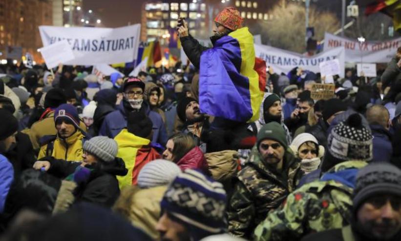 “Sram vas bilo!”, “Ostavka!”, uzvikuju okupljeni po jakoj zimi, protiveći se reviziji Krivičnog zakona koju je pripremila vlada Sorin Grindeanua, na vlasti manje od mjesec dana, od pobjede Socijaldemokrata na poslaničkim izborima u decembru.