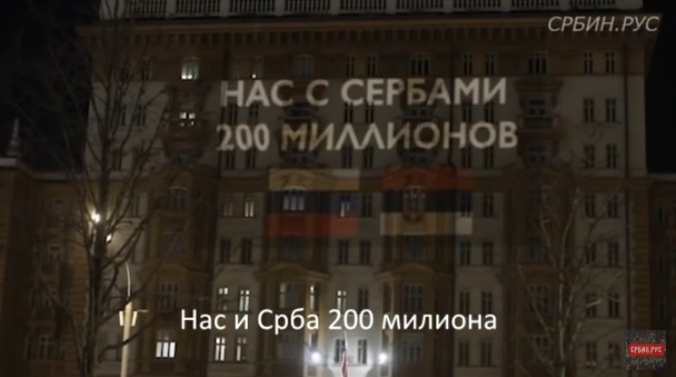 На згради амбасаде смјењивали су се слајдови уз заставе Русије и Србије.