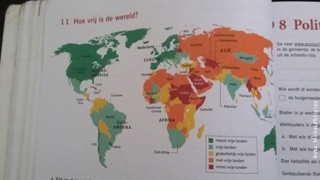 U njemu učenici mogu da nauče koje su zemlje „dobre“ i „loše“, a na mapi su raznim bojama predstavljene države u skladu sa stepenom slobode. Zemlje poput Rusije i Kine su označene kao „neslobodne“, dok su članice EU, SAD i još neke zemlje predstavljene kao najliberalnije.
